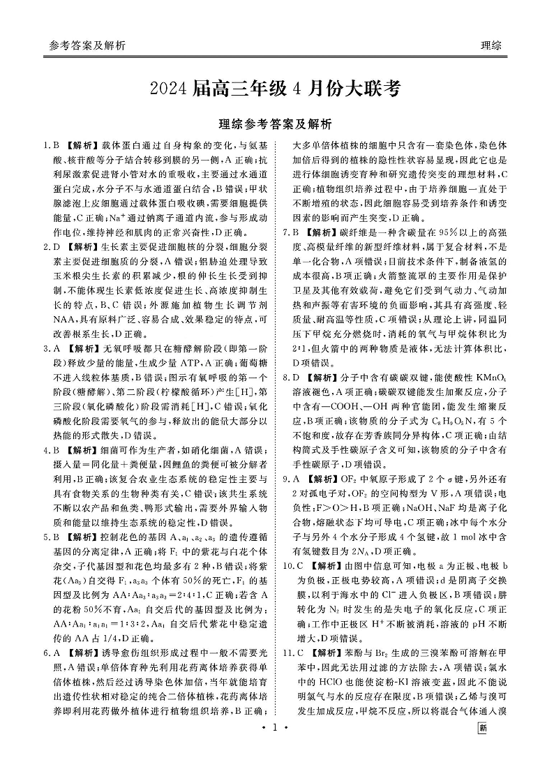 衡水金卷2024届高三4月大联考(新教材)理综答案