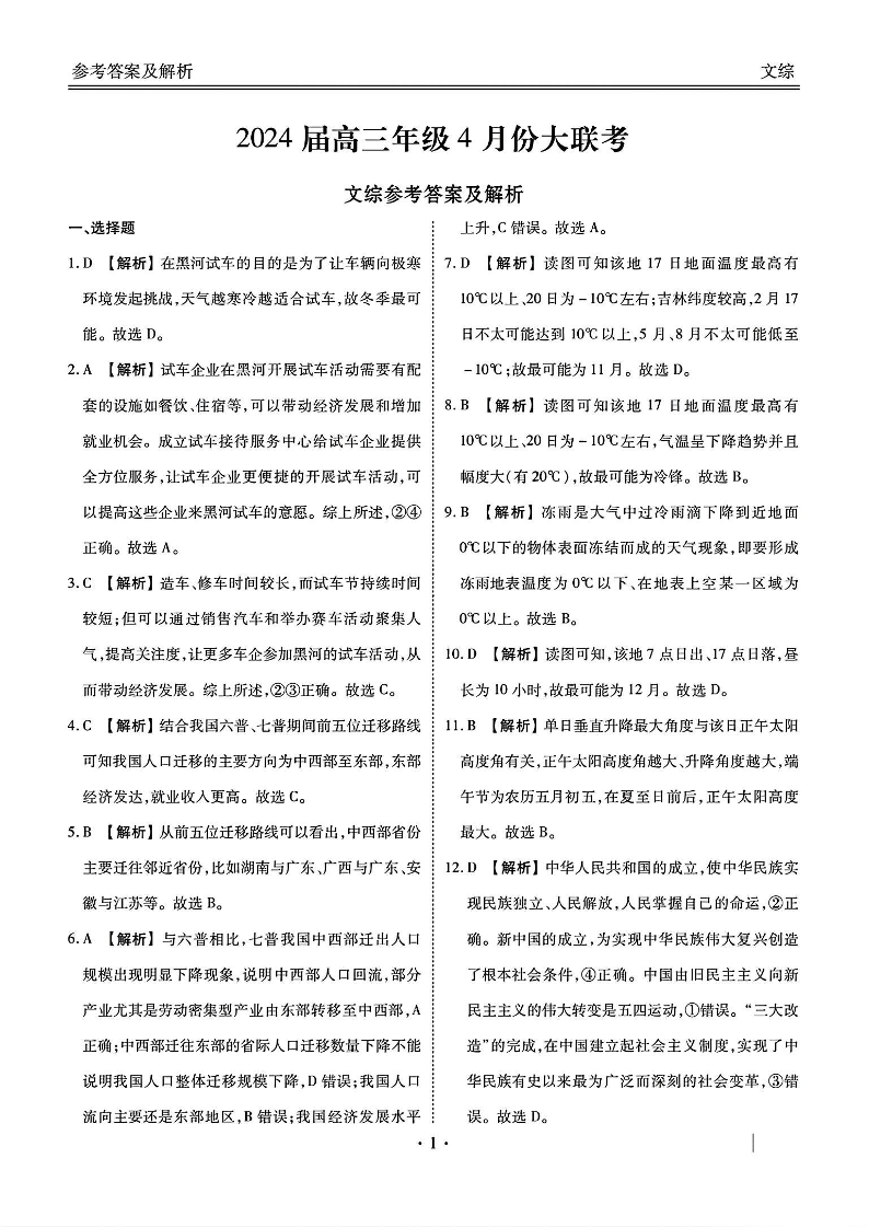 衡水金卷2024届高三4月大联考(新教材)文综答案