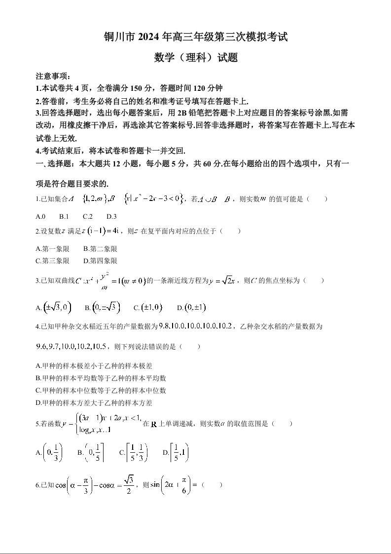 山西省临汾市2024届高三下学期考前适应性训练(三)(临汾三模)理科数学+答案