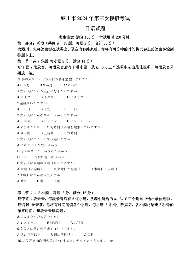 山西省临汾市2024届高三下学期考前适应性训练(三)(临汾三模)日语+答案