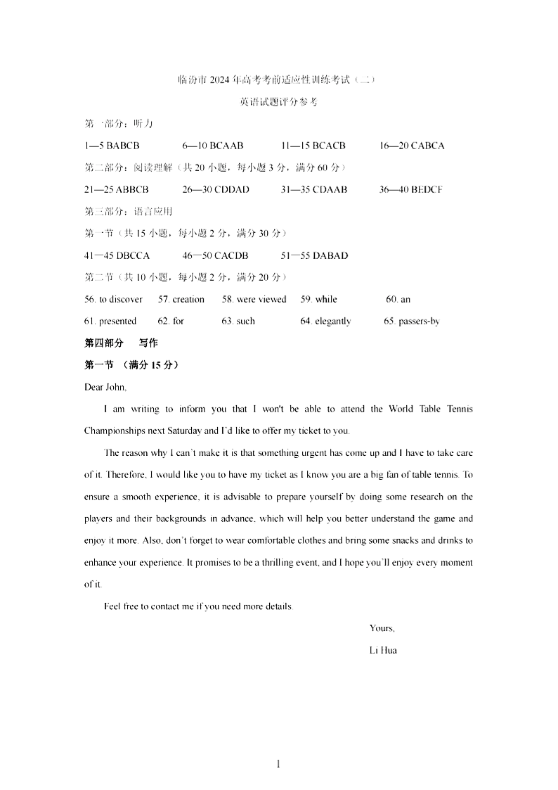 山西省临汾市2024届高三下学期考前适应性训练考试(临汾二模)英语答案