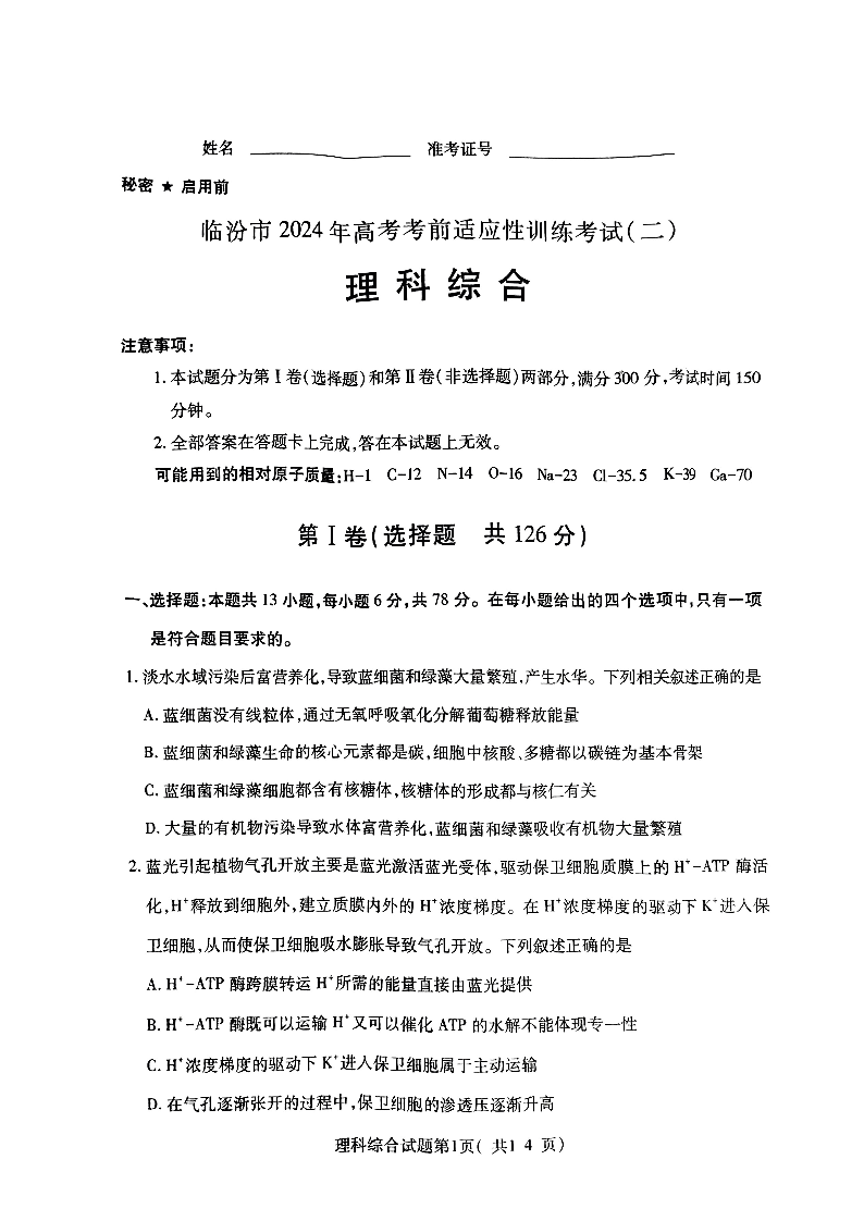 山西省临汾市2024届高三下学期考前适应性训练考试(临汾二模)理综