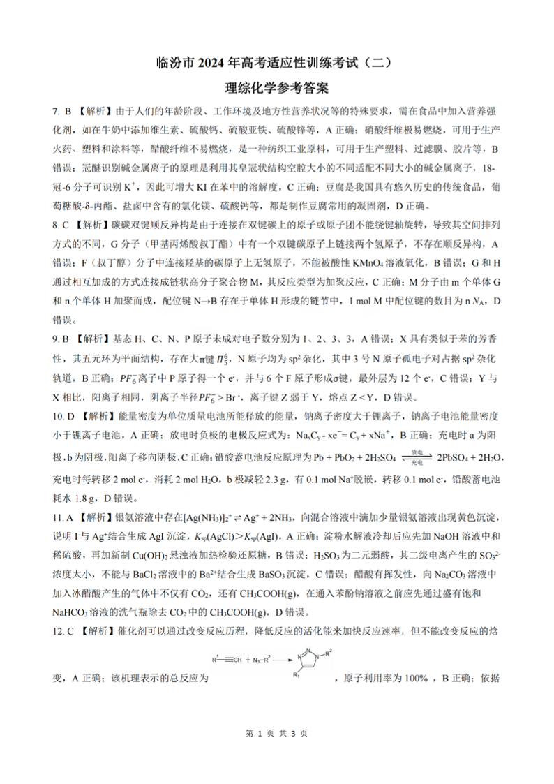 山西省临汾市2024届高三下学期考前适应性训练考试(临汾二模)理综答案