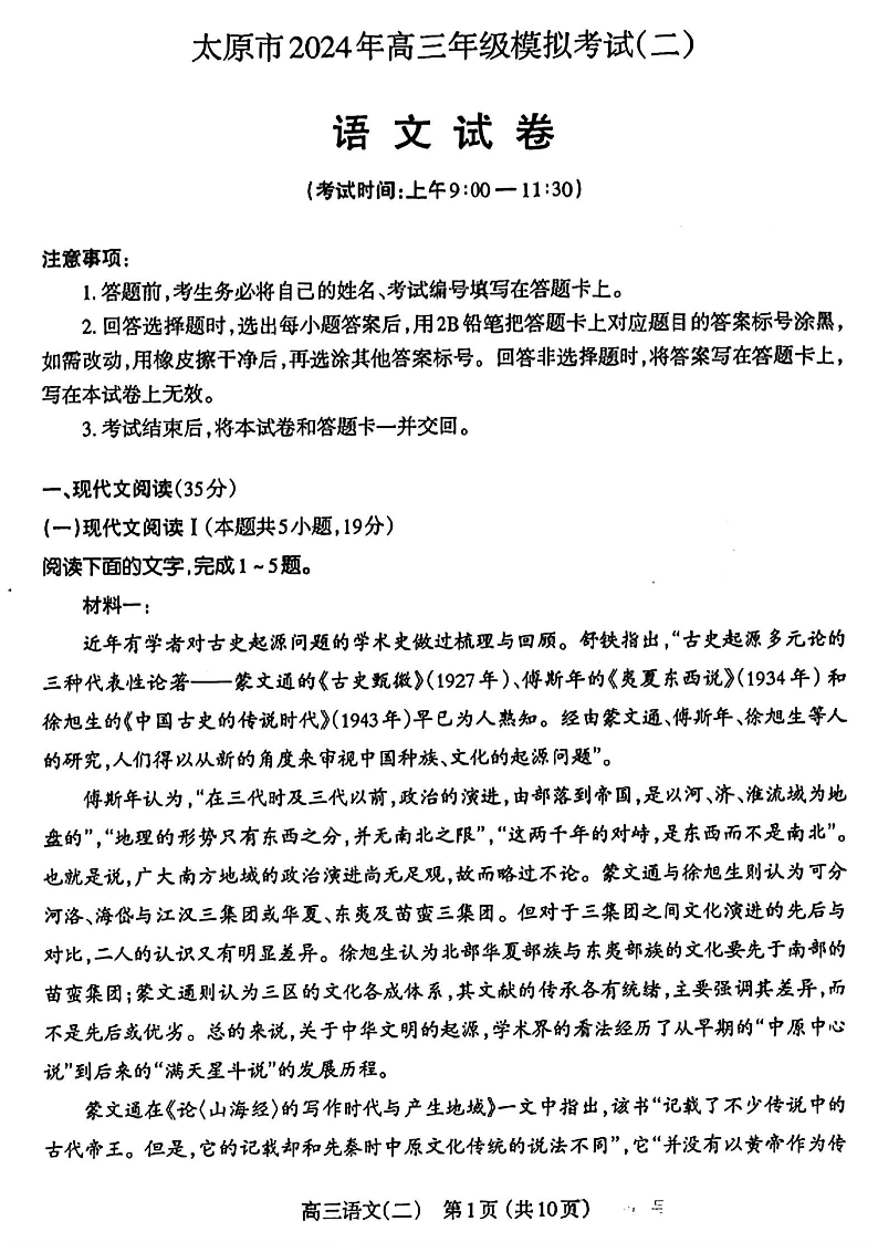 山西省太原市2024年高三年级模拟考试(二)(太原二模)语文