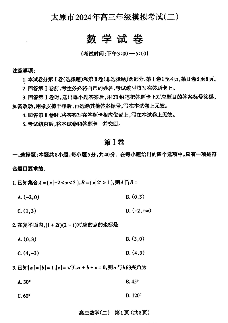 山西省太原市2024年高三年级模拟考试(二)(太原二模)数学