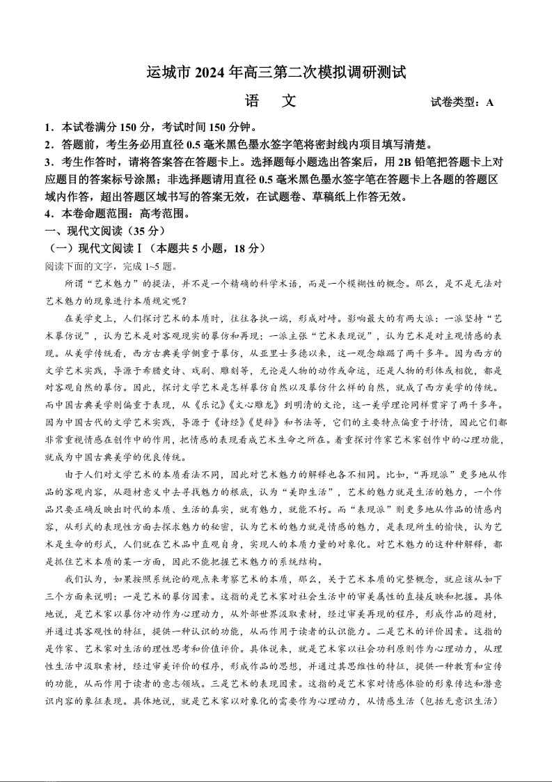 山西省运城市2024届高三第二次模拟调研测试(运城二模)语文+答案