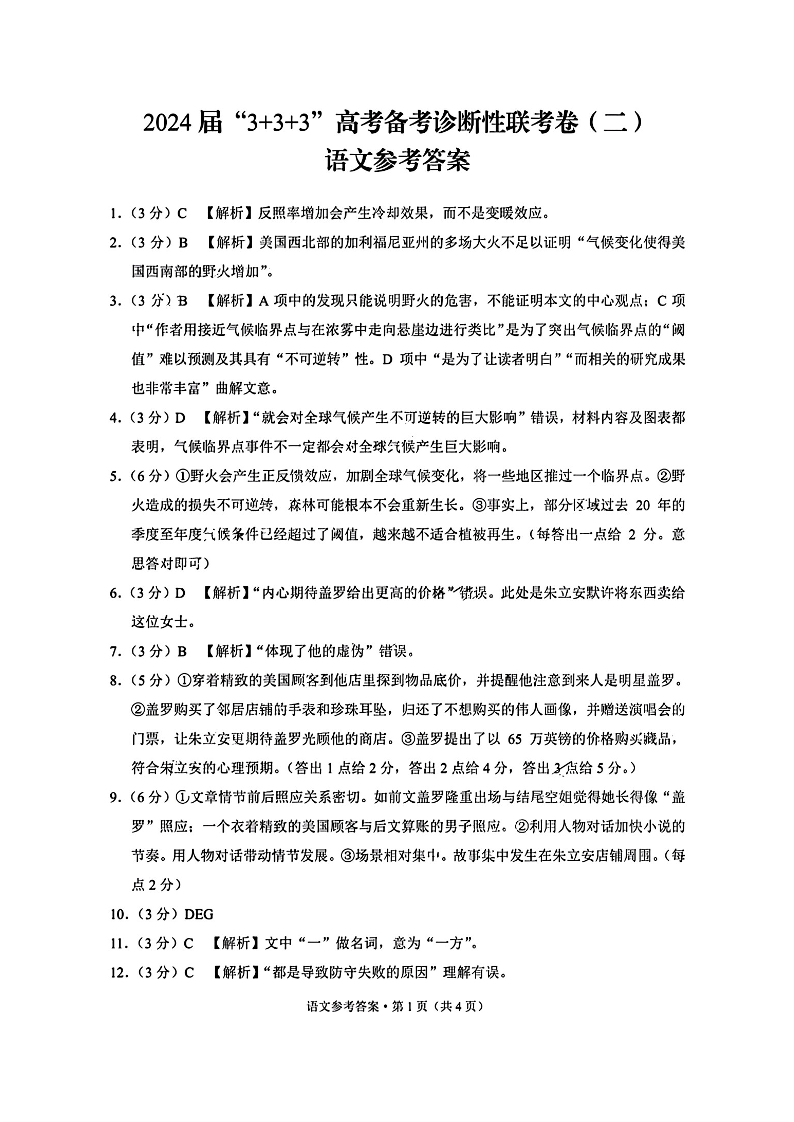 云南省2024届“3+3+3”高考备考诊断性联考卷(二)语文答案