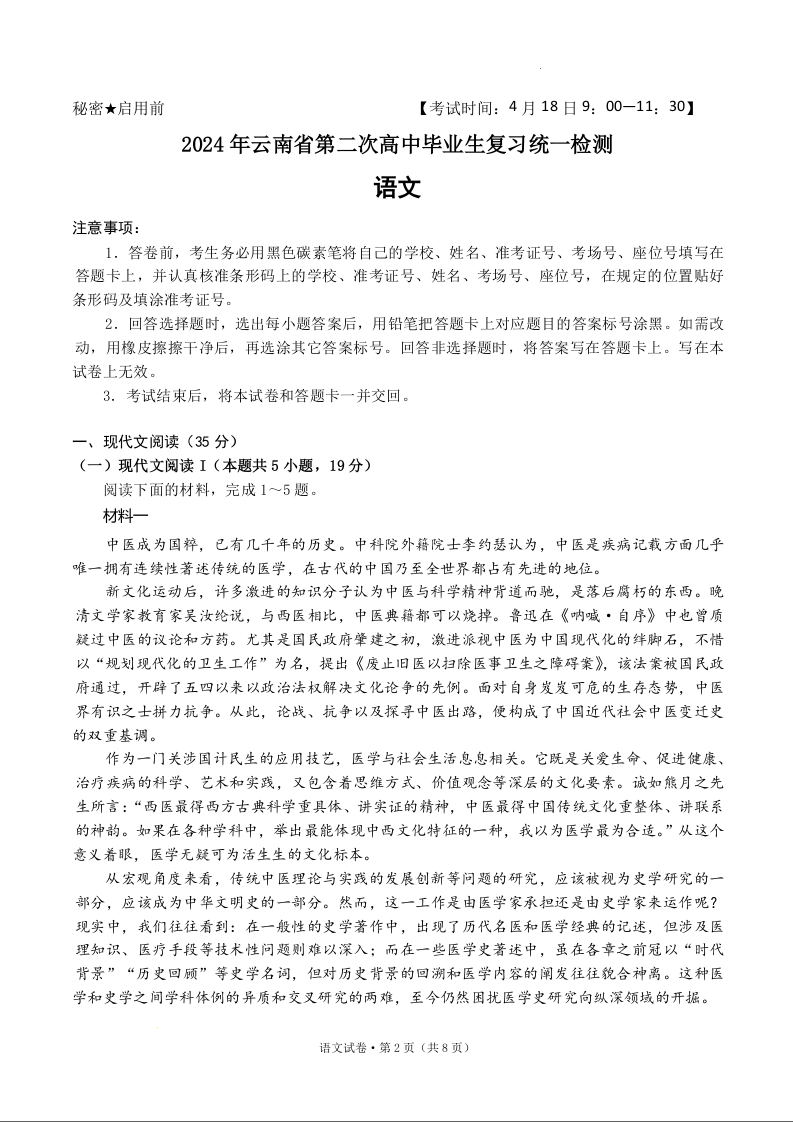 云南省2024届高三下学期第二次高中毕业生复习统一检测(云南二统)语文+答案