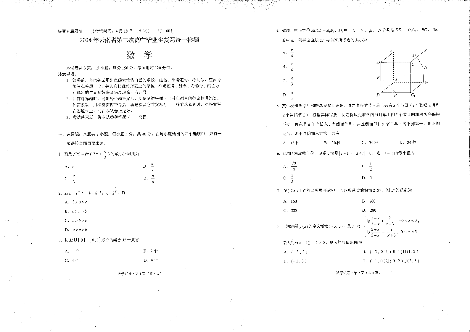 云南省2024届高三下学期第二次高中毕业生复习统一检测(云南二统)数学