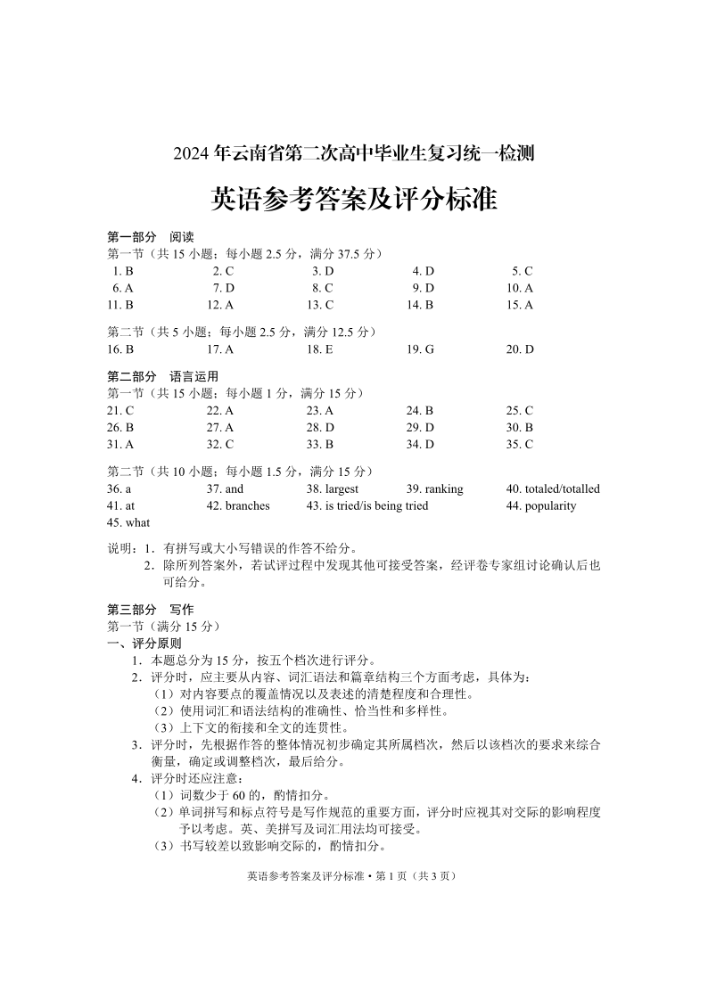 云南省2024届高三下学期第二次高中毕业生复习统一检测(云南二统)英语答案