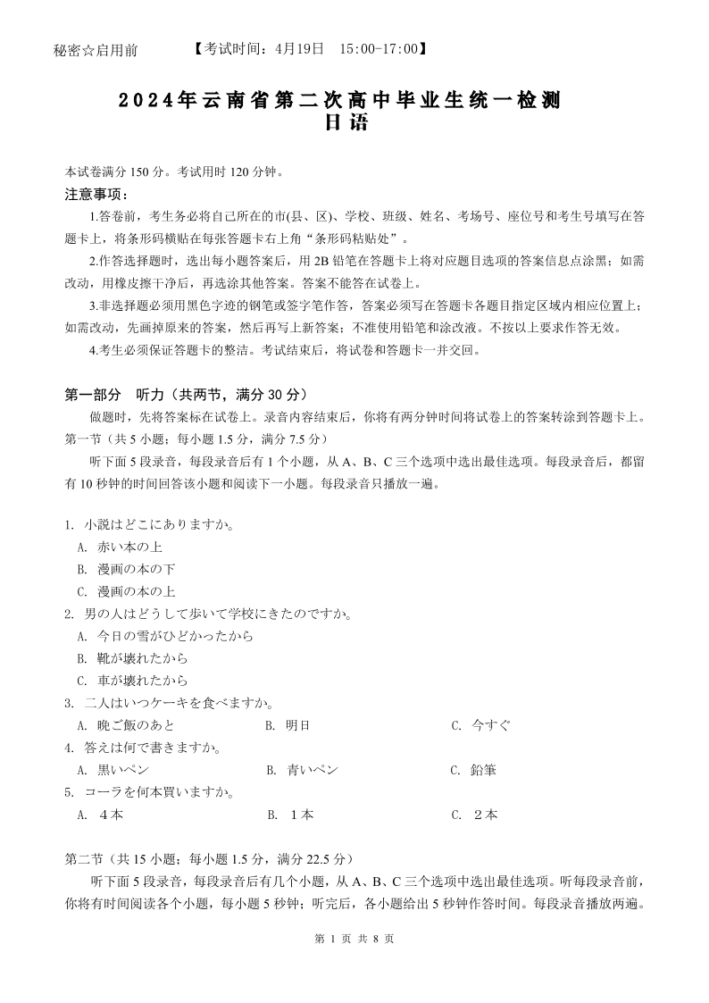 云南省2024届高三下学期第二次高中毕业生复习统一检测(云南二统)日语