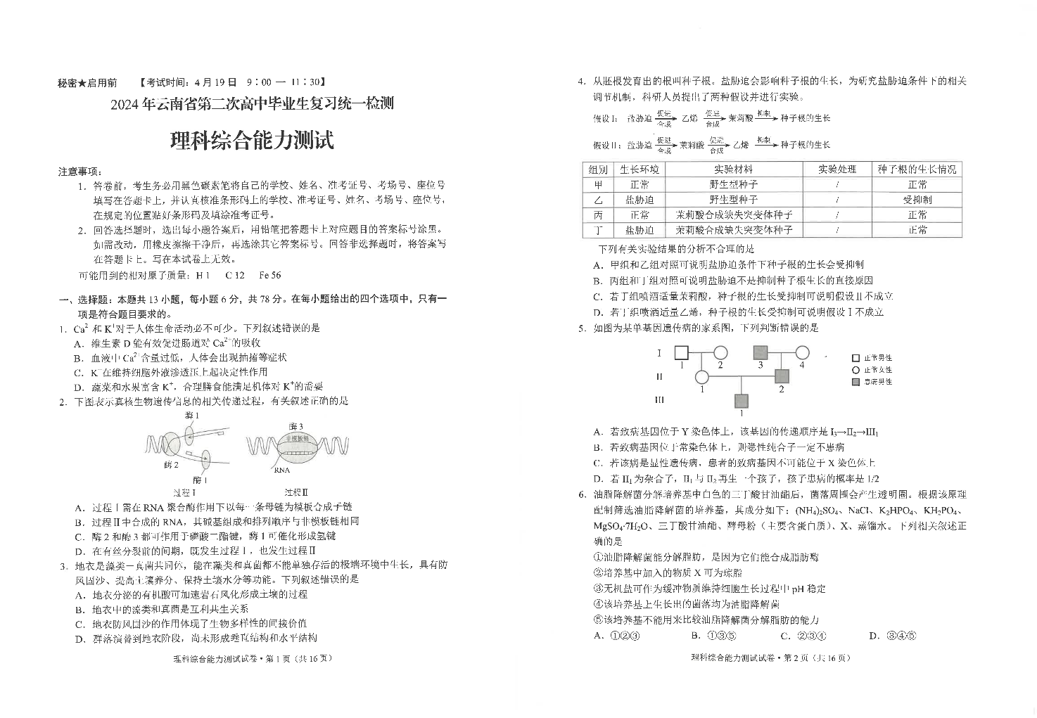云南省2024届高三下学期第二次高中毕业生复习统一检测(云南二统)理综