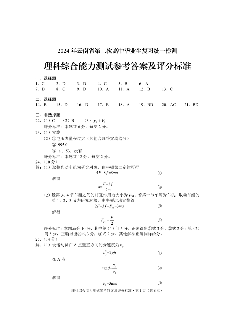 云南省2024届高三下学期第二次高中毕业生复习统一检测(云南二统)理综答案