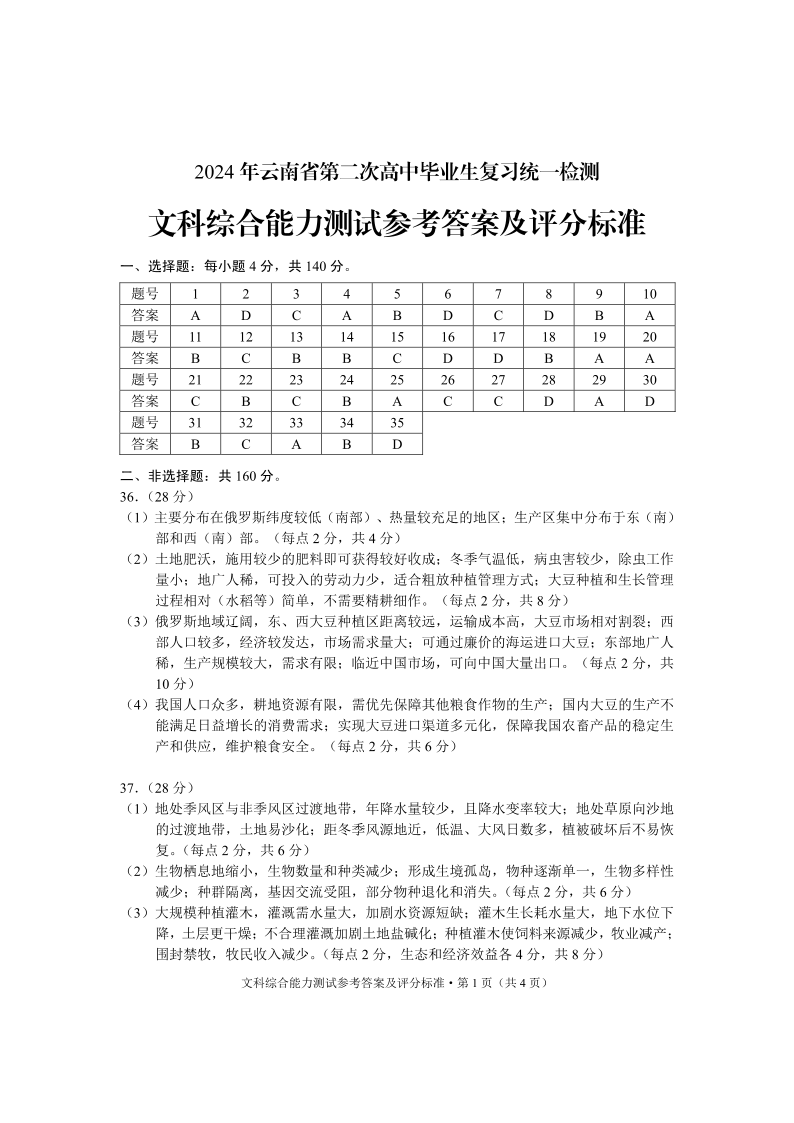 云南省2024届高三下学期第二次高中毕业生复习统一检测(云南二统)文综答案
