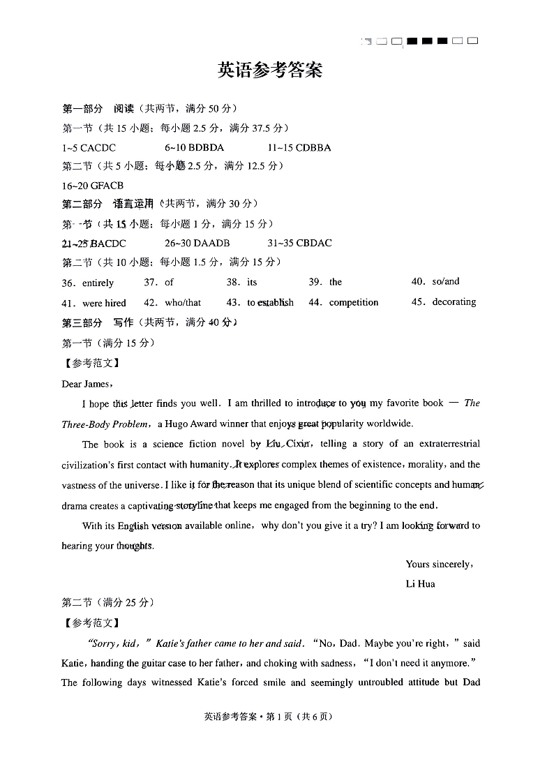 云南师范大学附属中学2024届高三下学期高考适应性月考卷(九)英语答案