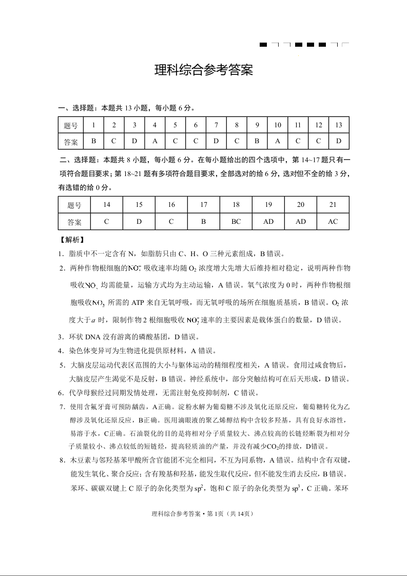 云南师范大学附属中学2024届高三下学期高考适应性月考卷(九)理综答案