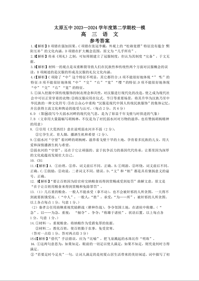 山西省太原市第五中学2024届高三下学期一模语文答案