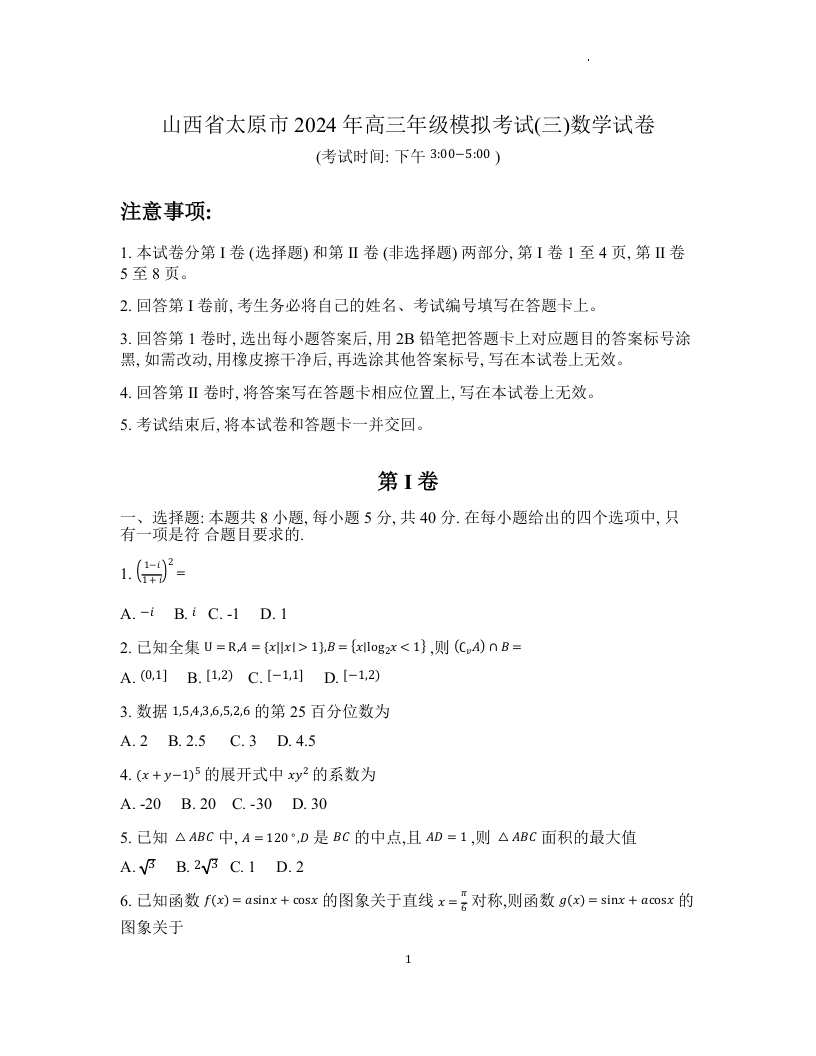 山西省太原市2024届高三下学期三模考试(太原三模)数学