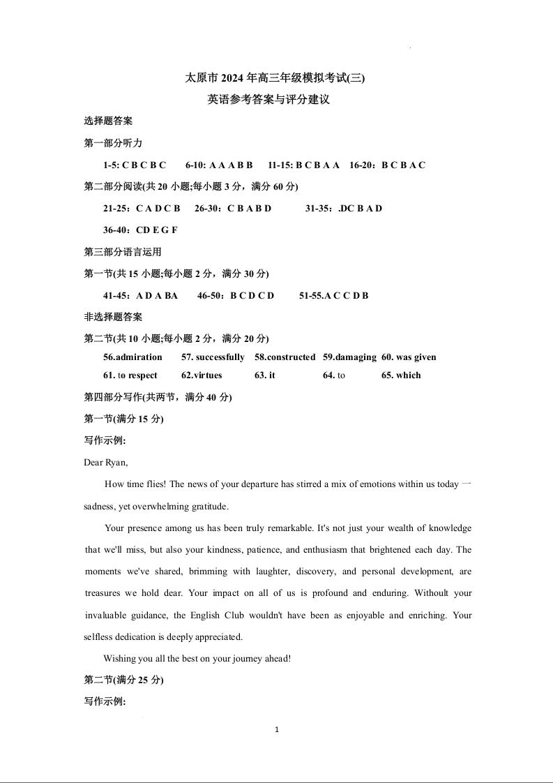 山西省太原市2024届高三下学期三模考试(太原三模)英语答案