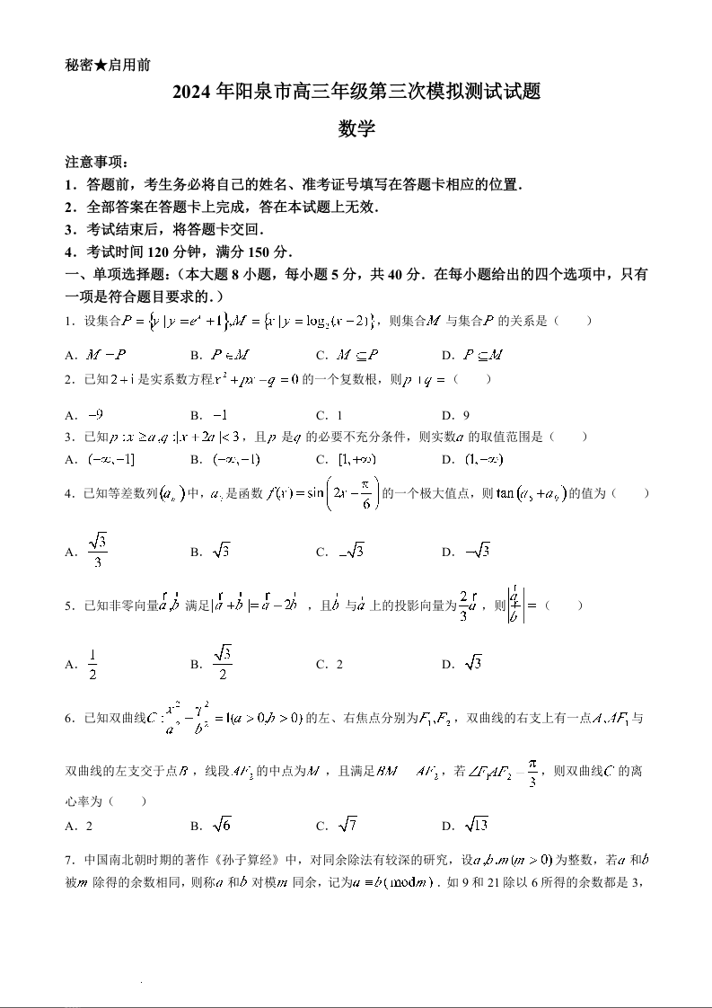 山西省阳泉市2024届高三下学期第三次模拟测试数学+答案