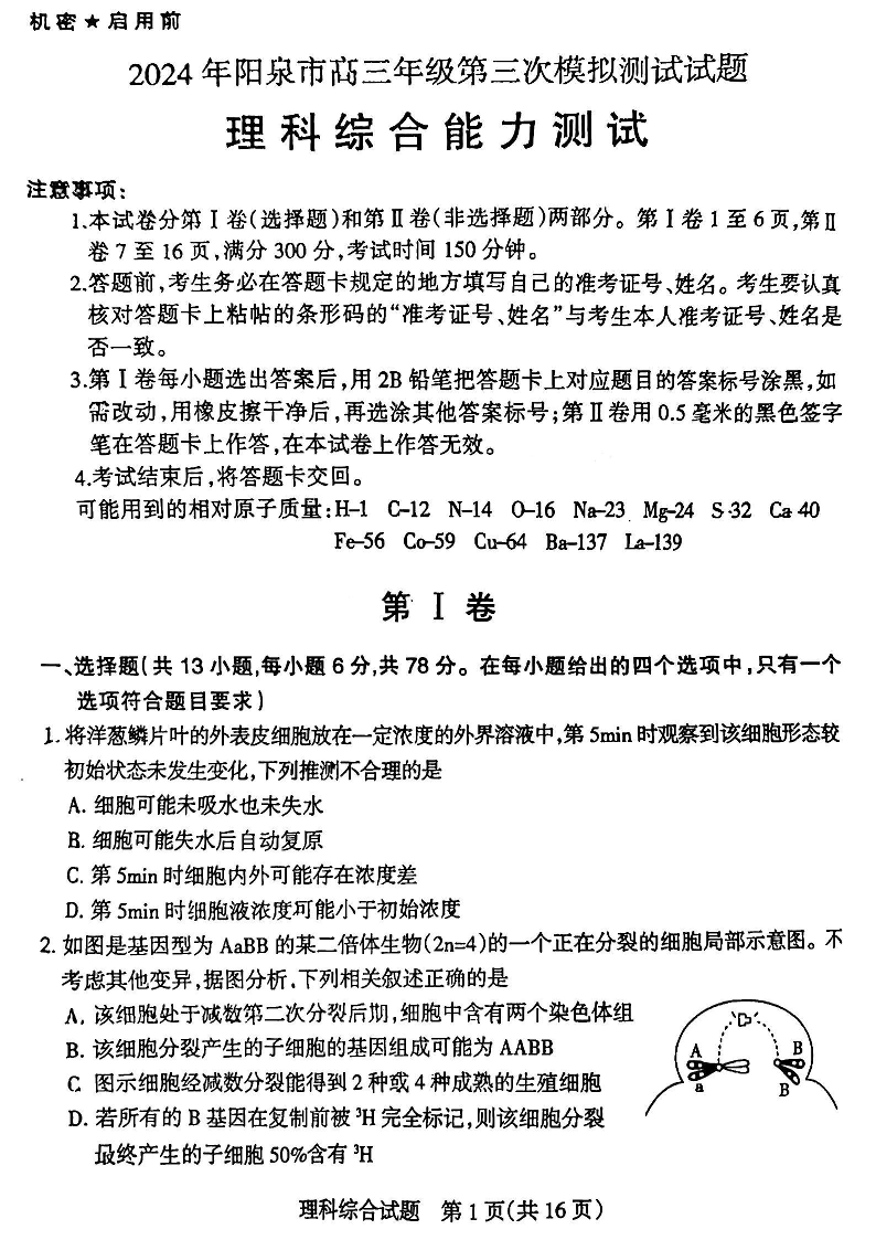 山西省阳泉市2024届高三下学期第三次模拟测试理科综合
