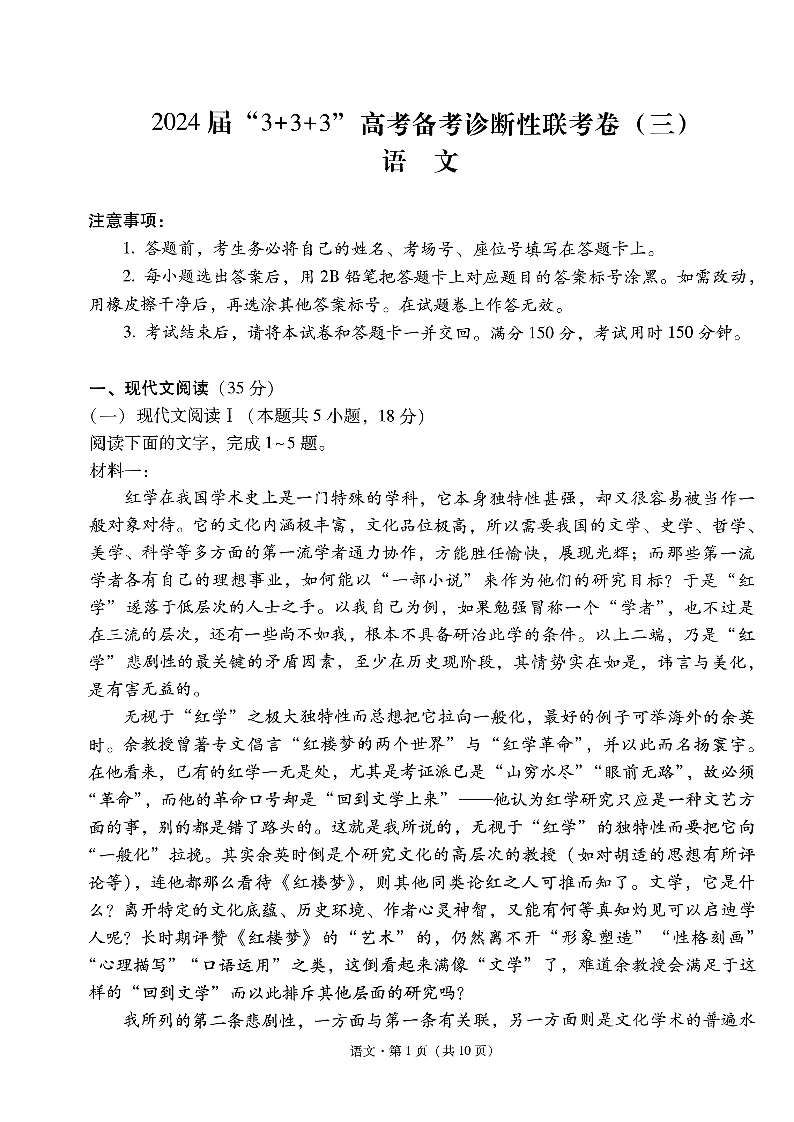 云南省3+3+3高三2024届下学期高考备考诊断性联考(三)语文