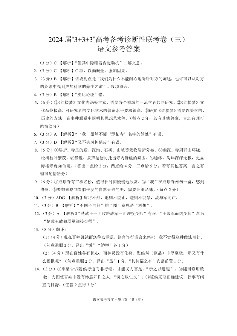 云南省3+3+3高三2024届下学期高考备考诊断性联考(三)语文答案