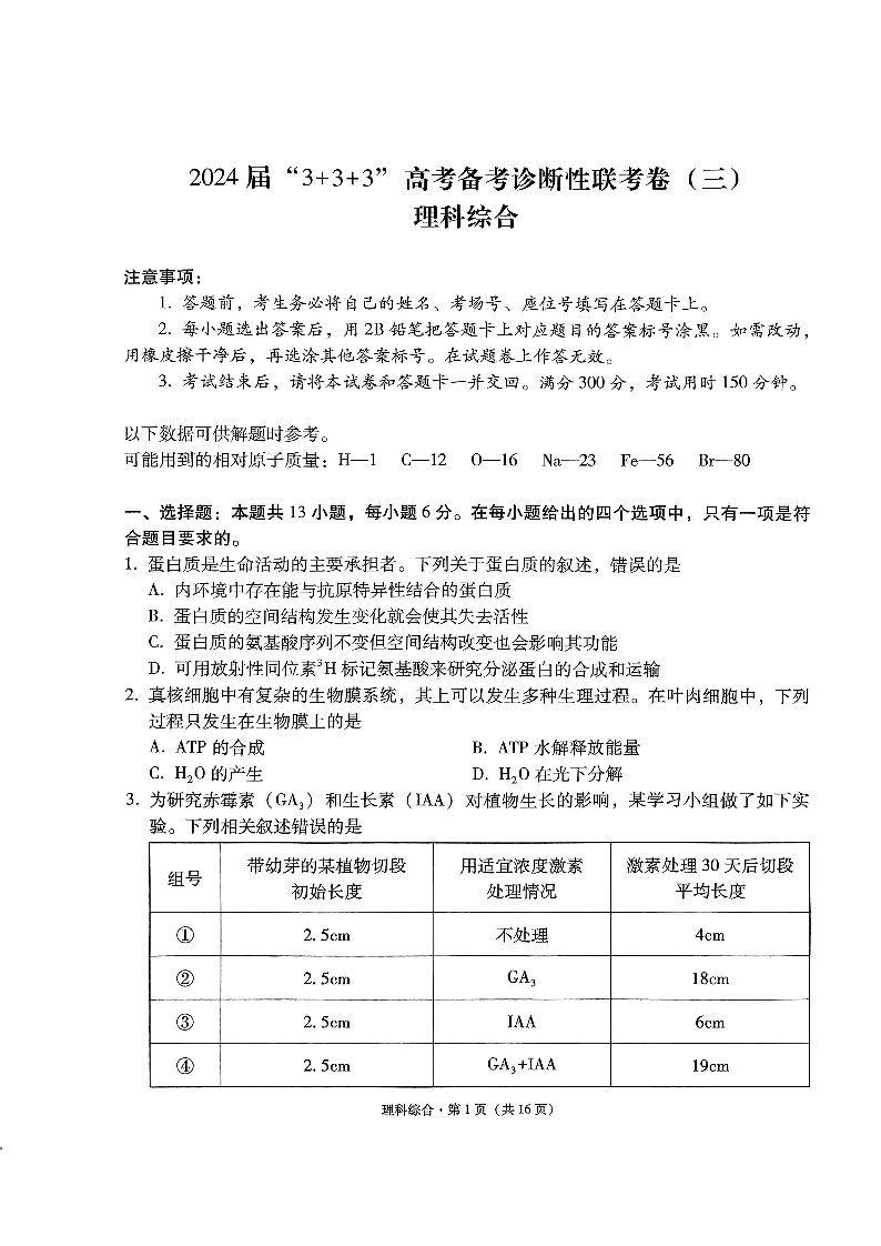 云南省3+3+3高三2024届下学期高考备考诊断性联考(三)理综