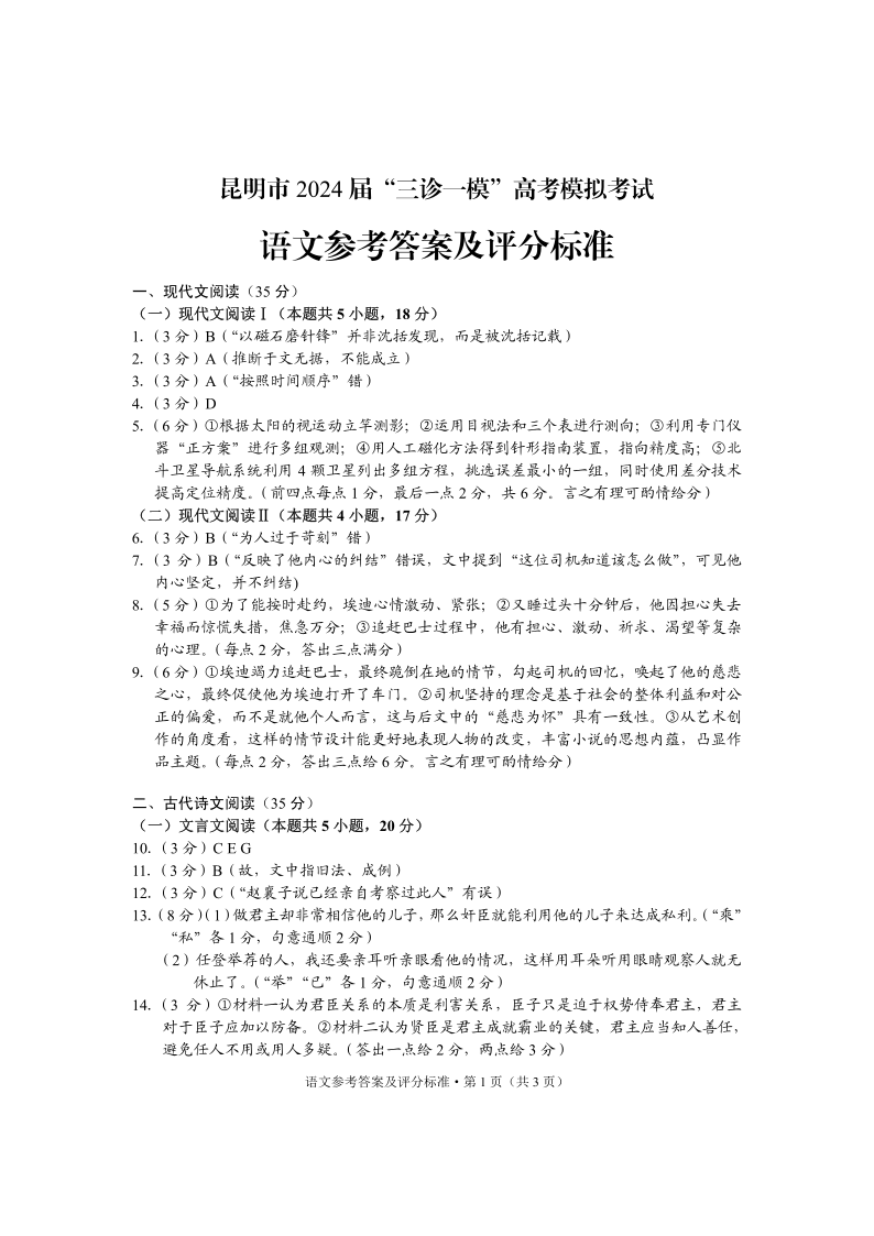 云南省昆明市2024届三诊一模高考模拟考试(昆明三模)语文答案