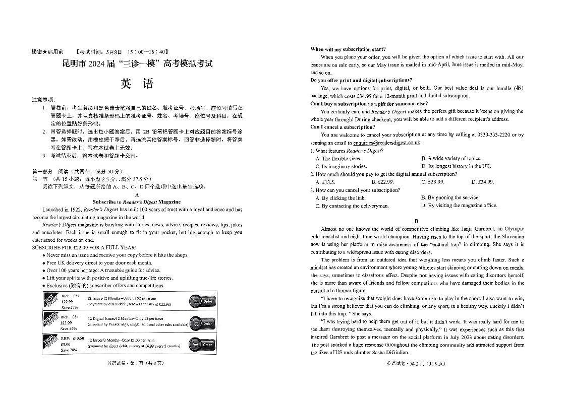 云南省昆明市2024届三诊一模高考模拟考试(昆明三模)英语