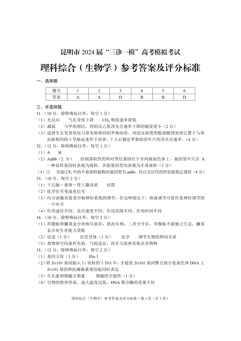 云南省昆明市2024届三诊一模高考模拟考试(昆明三模)生物学答案