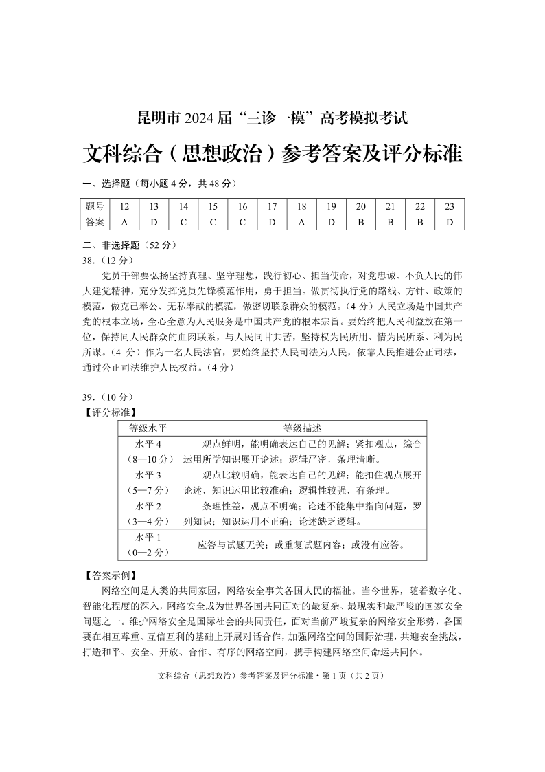 云南省昆明市2024届三诊一模高考模拟考试(昆明三模)政治答案
