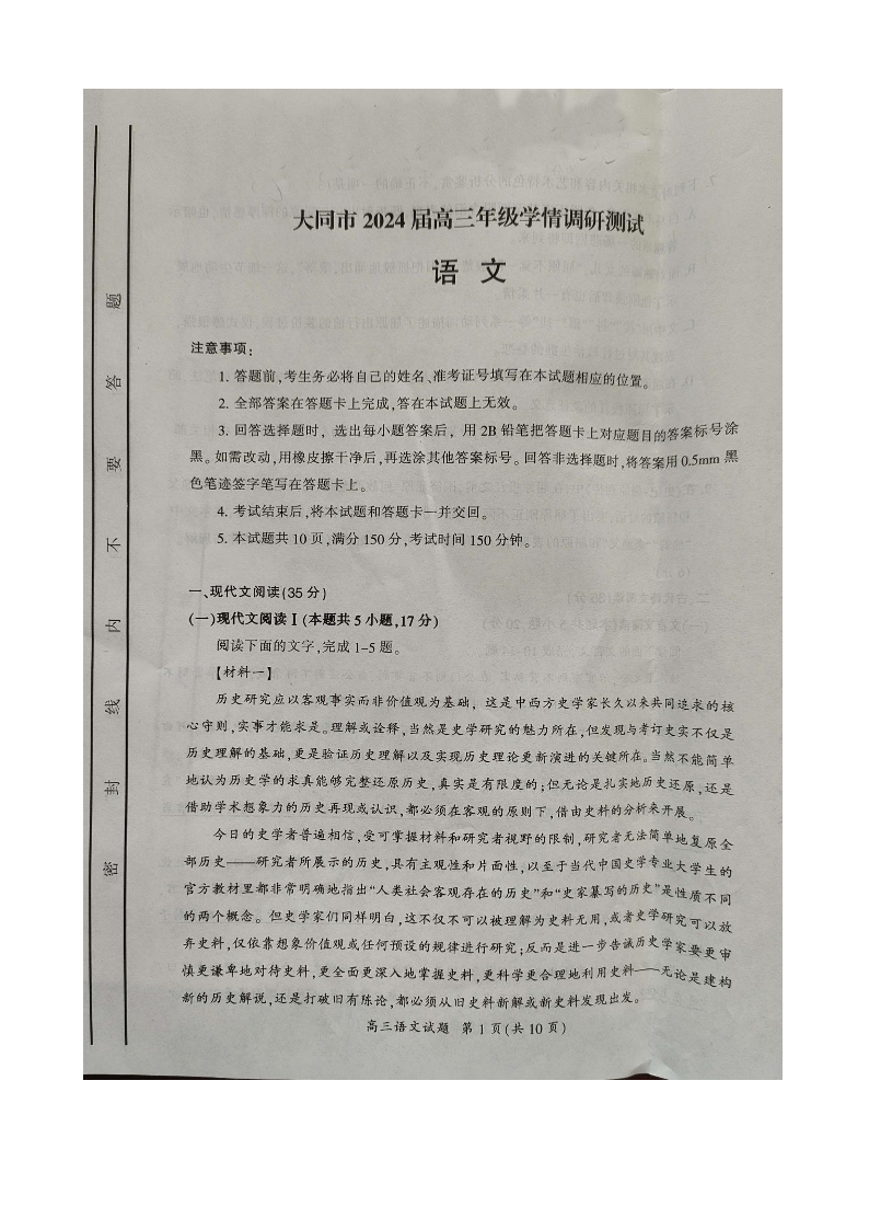山西省大同市2024届高三年级学情调研测试语文