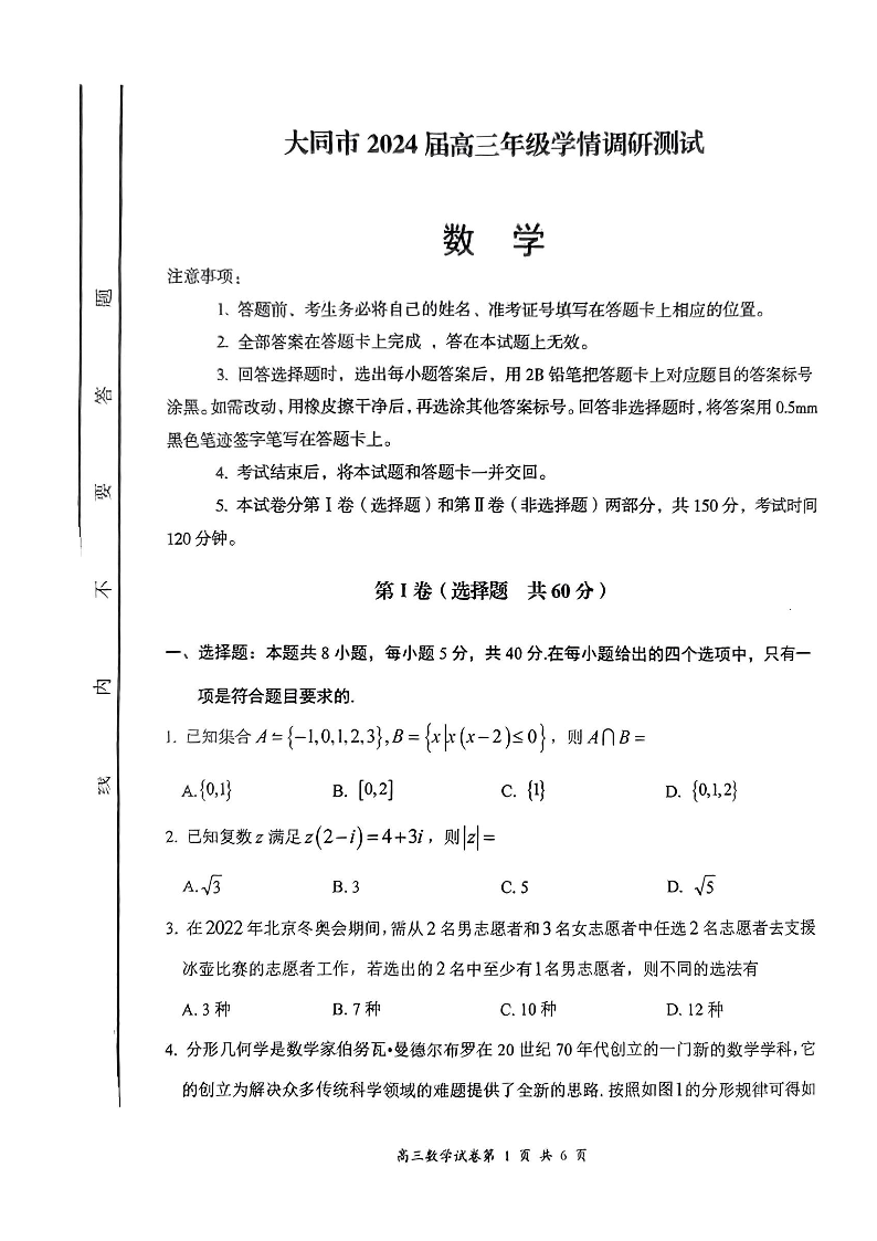 山西省大同市2024届高三年级学情调研测试数学