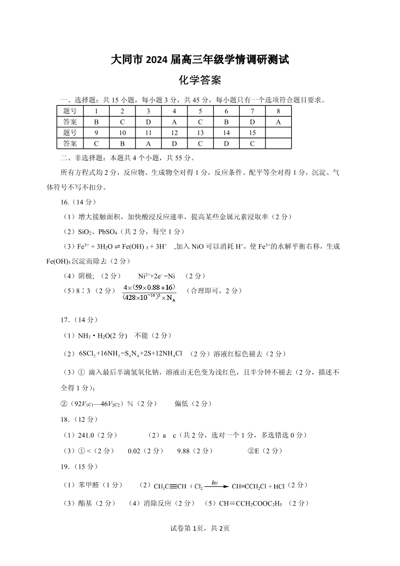 山西省大同市2024届高三年级学情调研测试化学答案