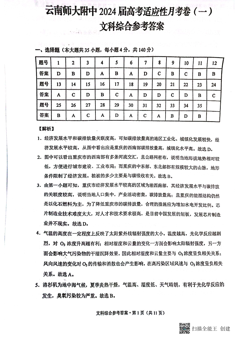 云南省昆明市云南师大附中2024届高考适应性月考卷(一)文综答案
