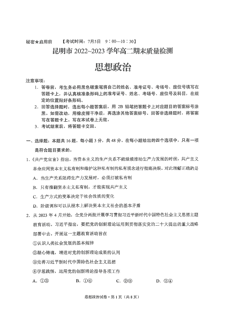 云南省昆明市2024届下学期期末考试政治