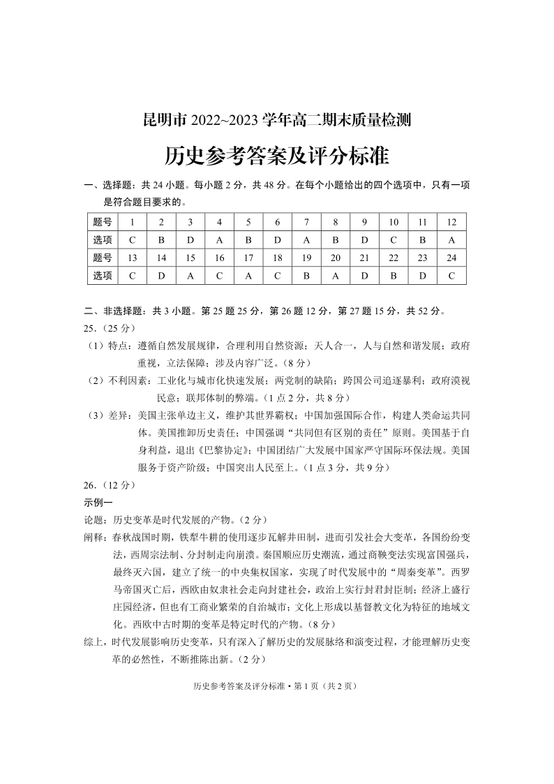 云南省昆明市2024届下学期期末考试历史答案