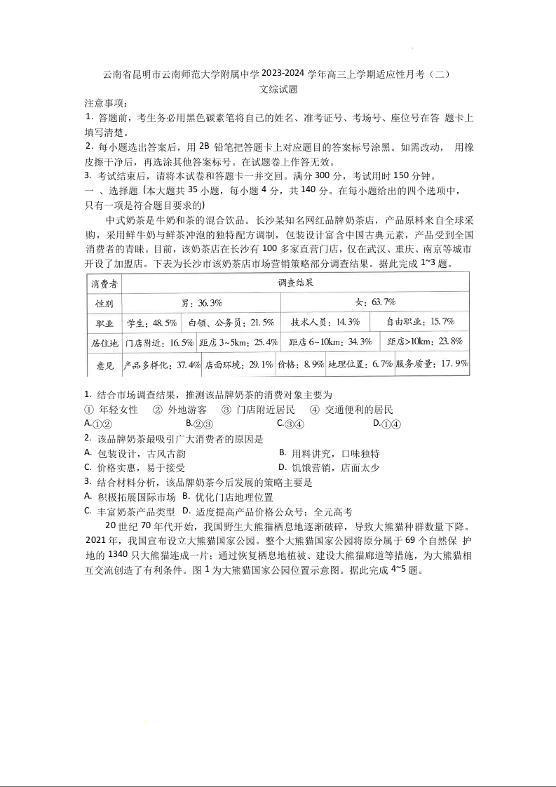 云南省昆明市2024届云南师范大学附属中学高考适应性月考(二)文综