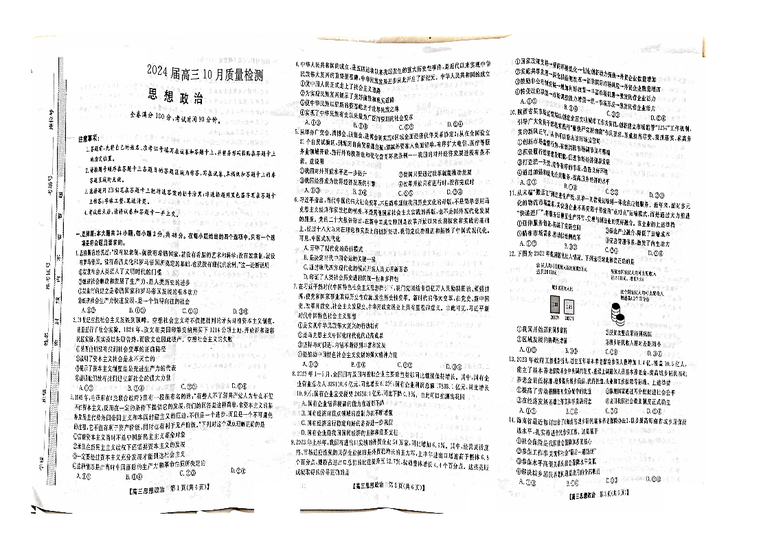 山西省部分学校2024届高三上学期10月联考政治+答案