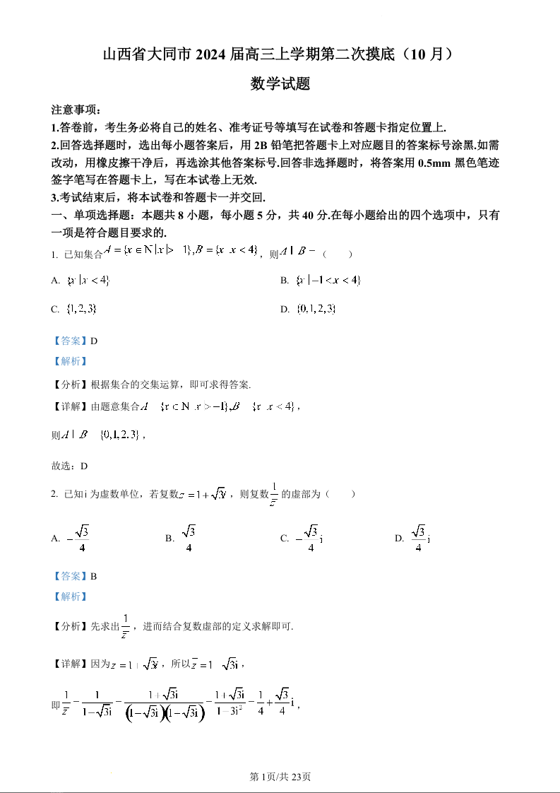 山西省大同市2024届高三上学期10月月考数学(精品解析版)