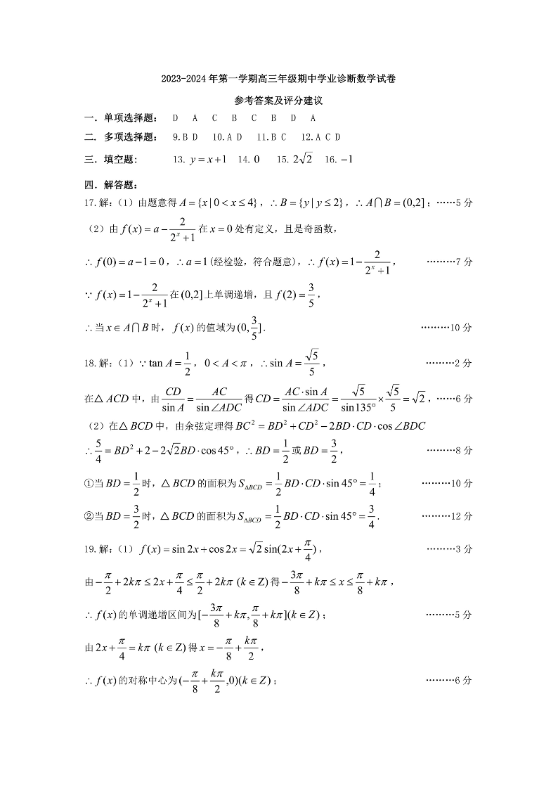 山西省太原市2024届高三上学期期中学业诊断数学答案
