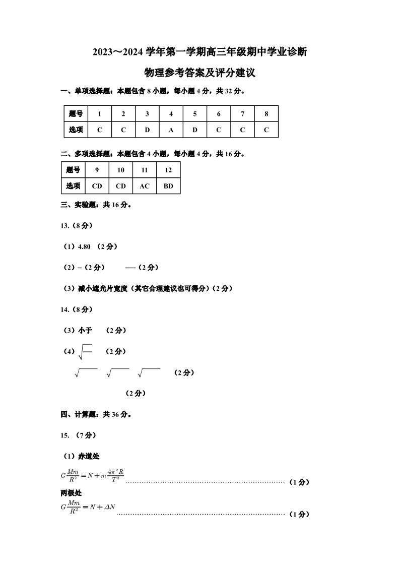 山西省太原市2024届高三上学期期中学业诊断物理答案