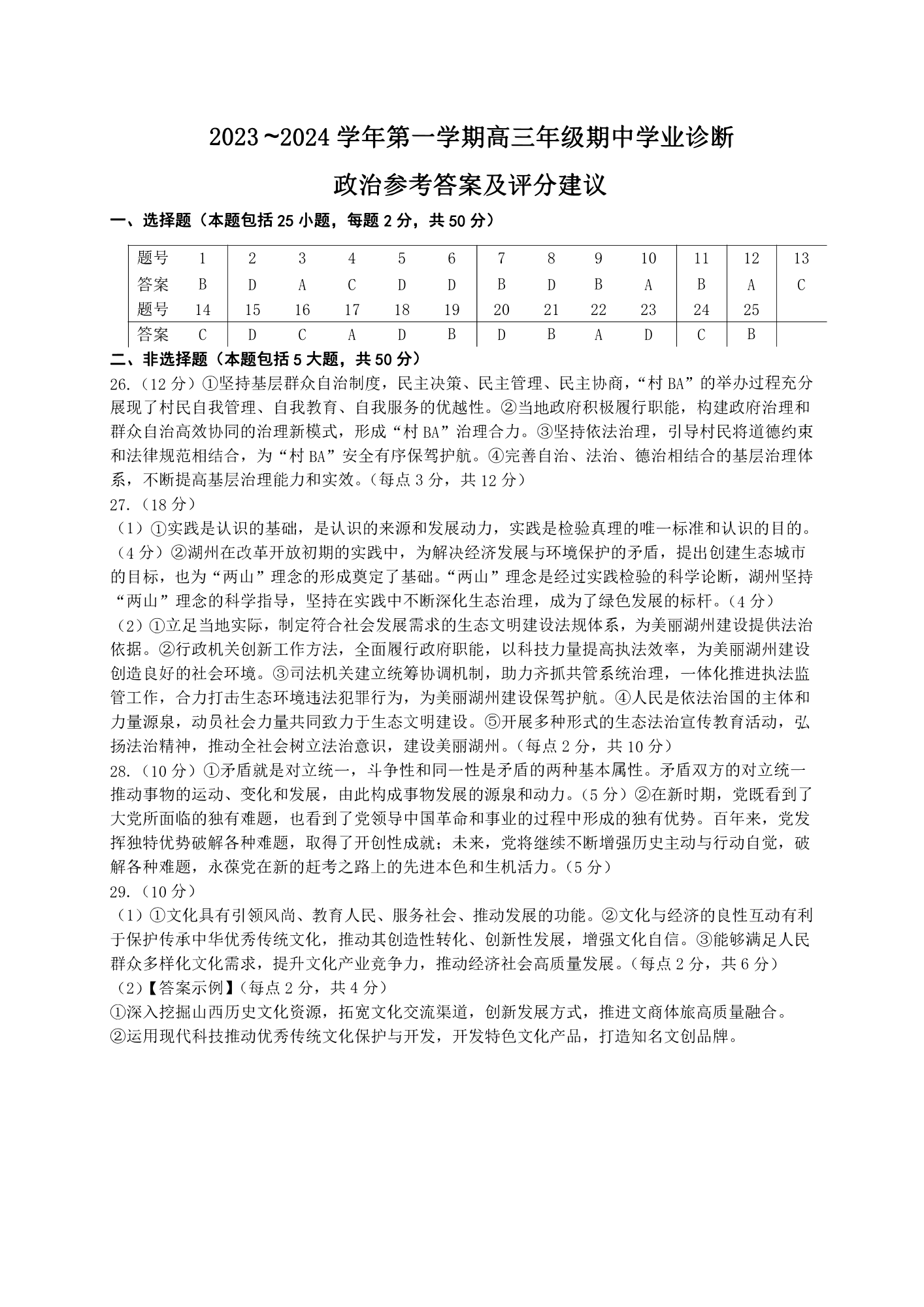 山西省太原市2024届高三上学期期中学业诊断政治答案