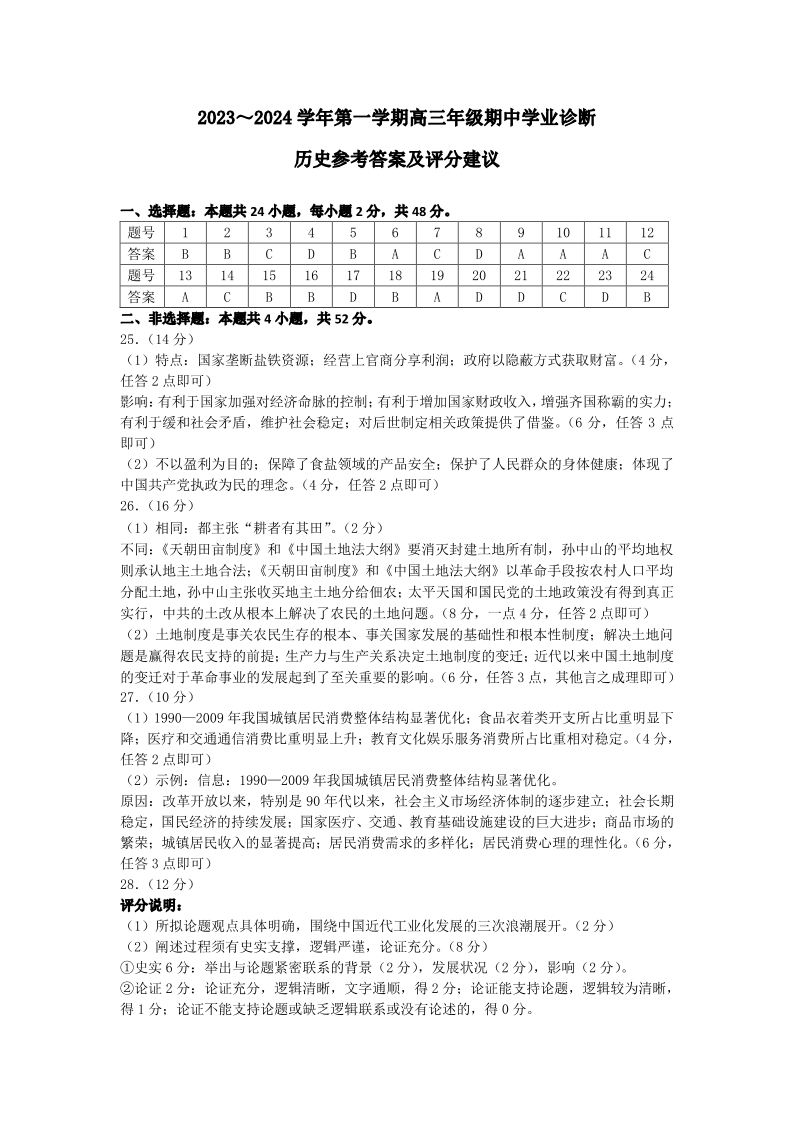 山西省太原市2024届高三上学期期中学业诊断历史答案