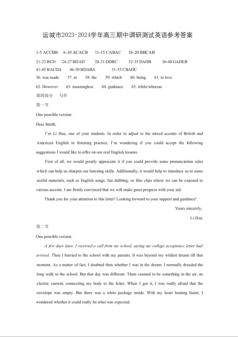 山西省运城市2024届高三上学期11月期中考试英语答案