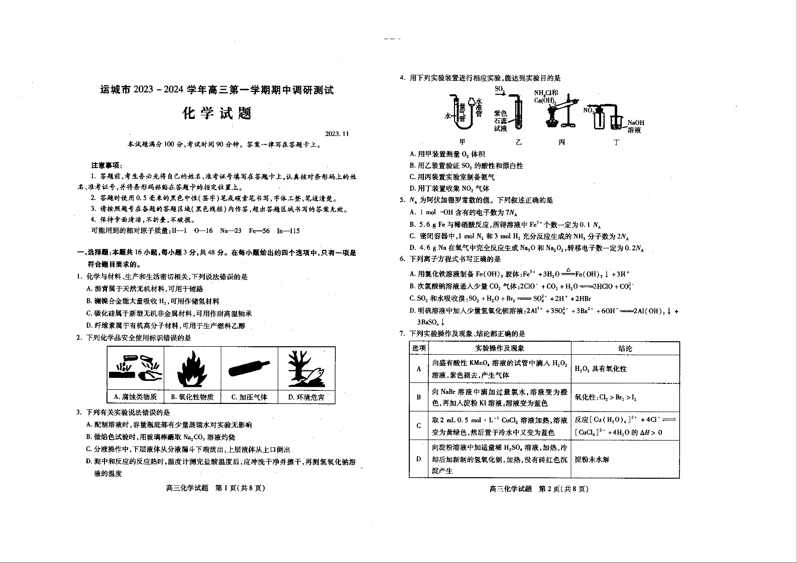 山西省运城市2024届高三上学期11月期中考试化学