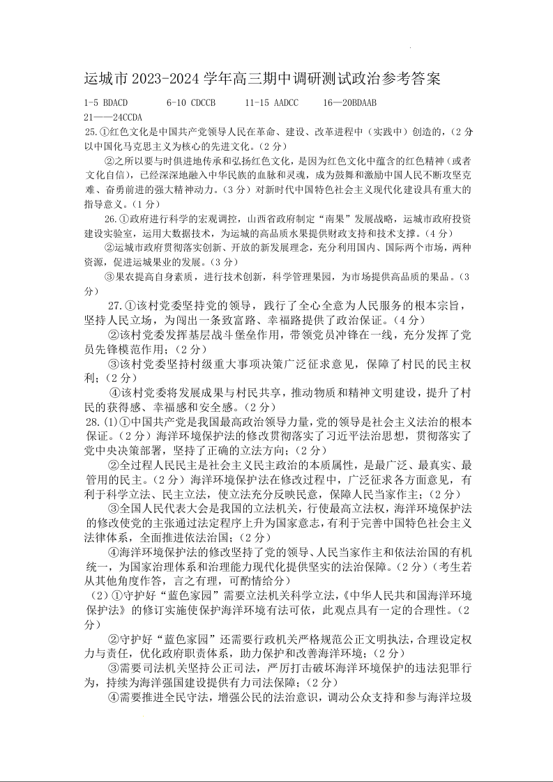 山西省运城市2024届高三上学期11月期中考试政治答案