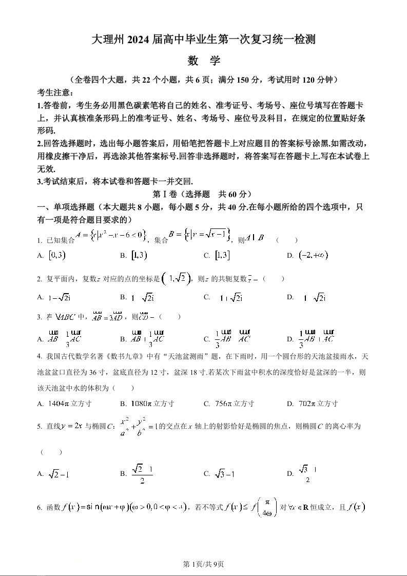 云南省大理州2024届高三毕业生第一次复习统一检测数学+答案