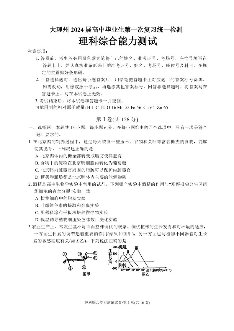 云南省大理州2024届高三毕业生第一次复习统一检测理综